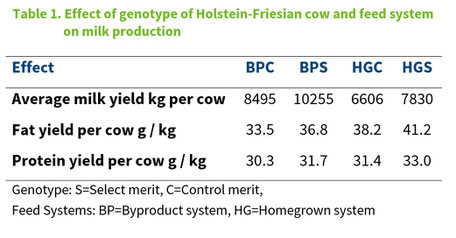Performance results show BP system cows averaging 9375kgs milk with daily yield averages of 29.7kg and 34.6kg for Control and Select animals being milked three times per day. Cows consuming a HG diet were averaging 8,440 kgs with dairy yield averages of 23.2kg and 25.1kg for Control and Select cows respectively. The BP system requires no on farm land and fully purchased feedstuffs with prices linked to global markets, whereas the HG system relies on crops grown in local climate and no purchased feeds except minerals.Contrasing technical performance as well as GHG emissions and nutrient use efficiencies are expected to arise from the diets, genotypes and housing systems containing leguminous co-products or legumes grown in the UK.